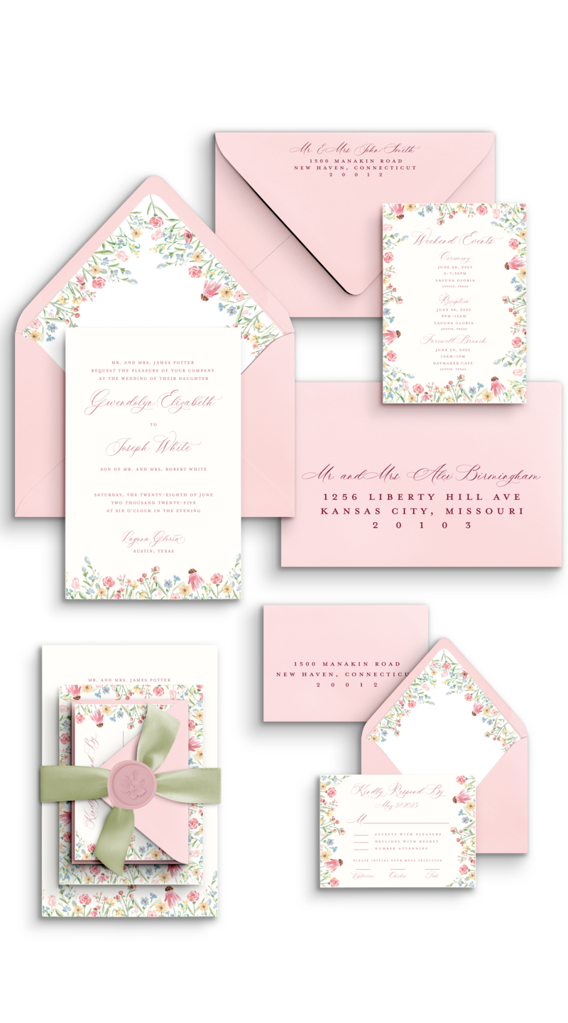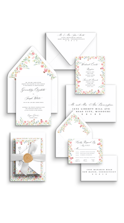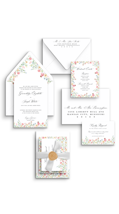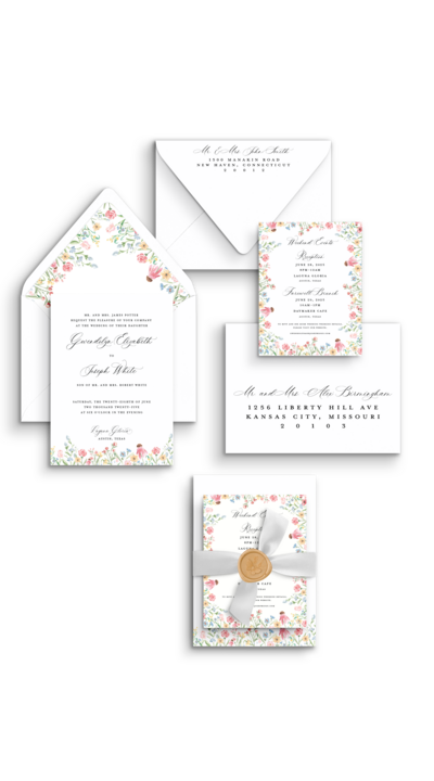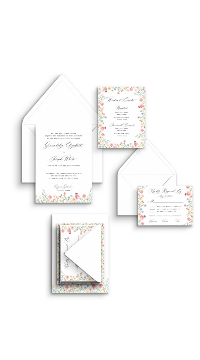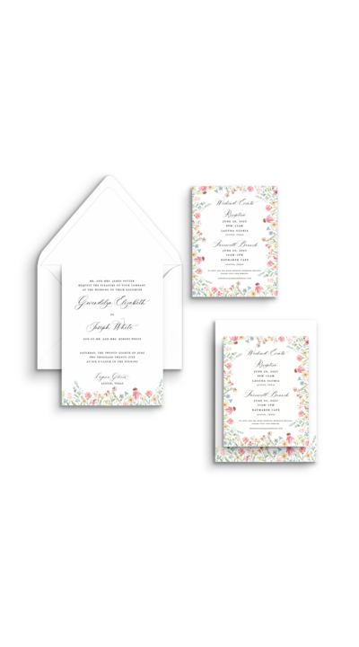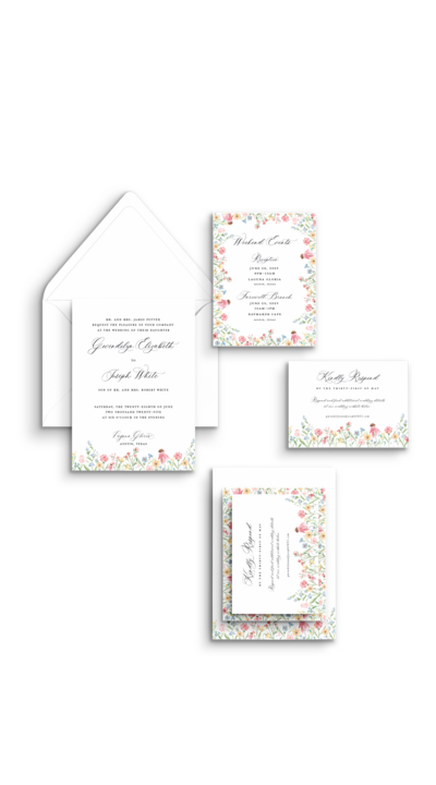 Inspired by her love of the outdoors and her Texas garden, I incorporated hand-painted wildflowers that seem to grow organically from the edges of the cards into the text, evoking the beautiful, unpredictable, and ever-changing nature of love.