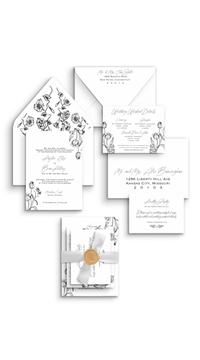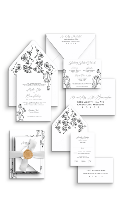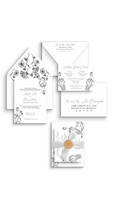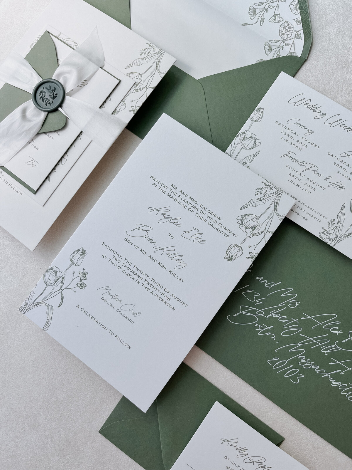 Embellishments shown: envelope liners, envelope addressing, wax seals, silk ribbon.