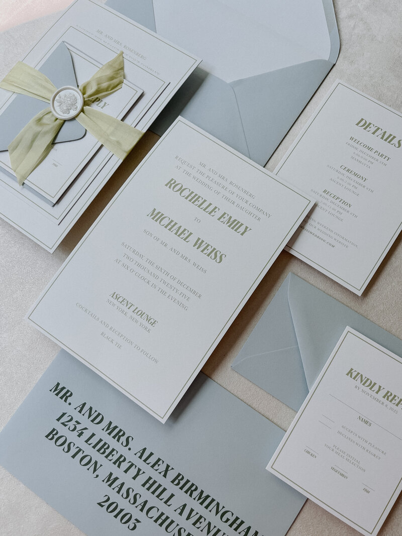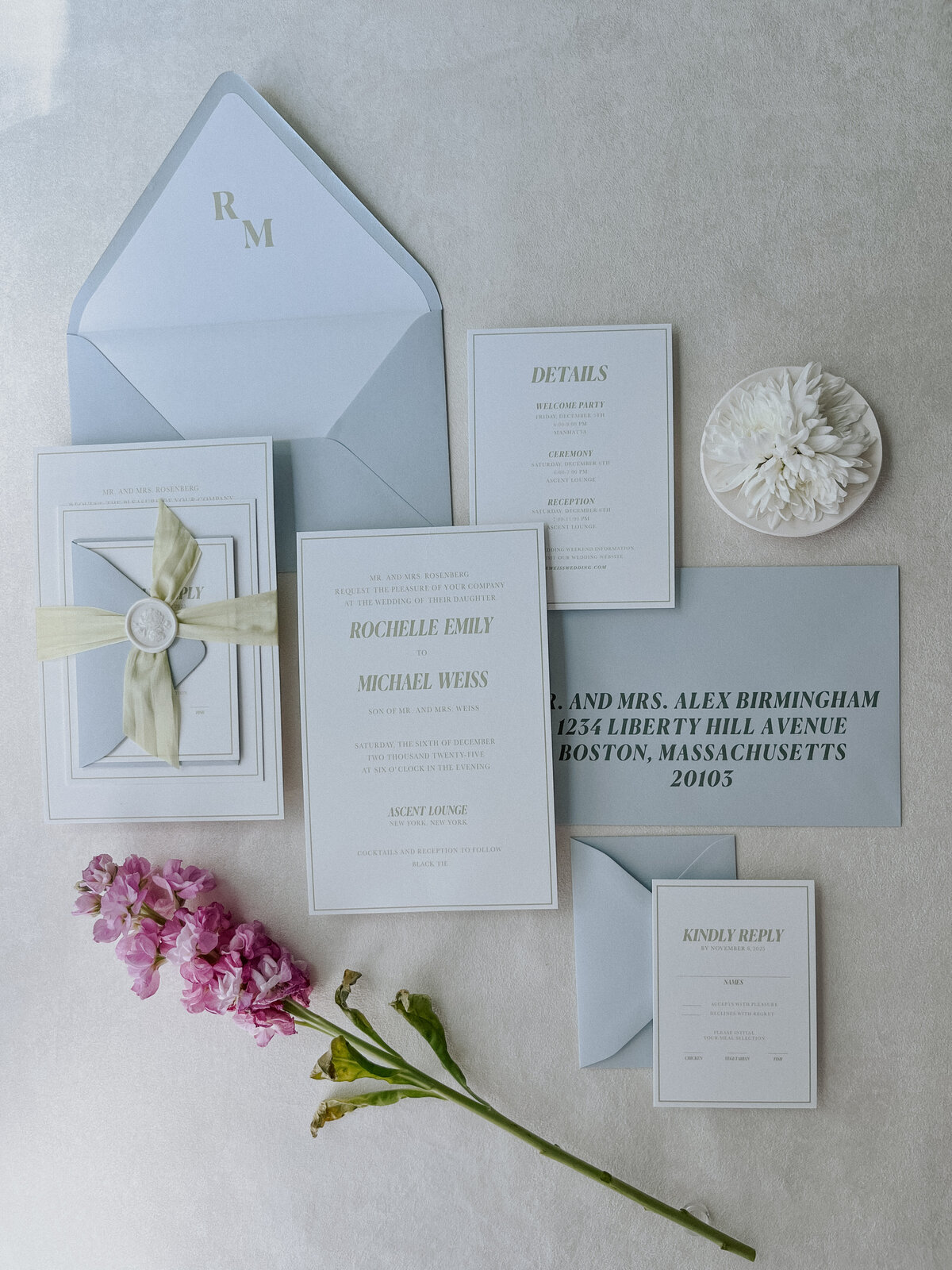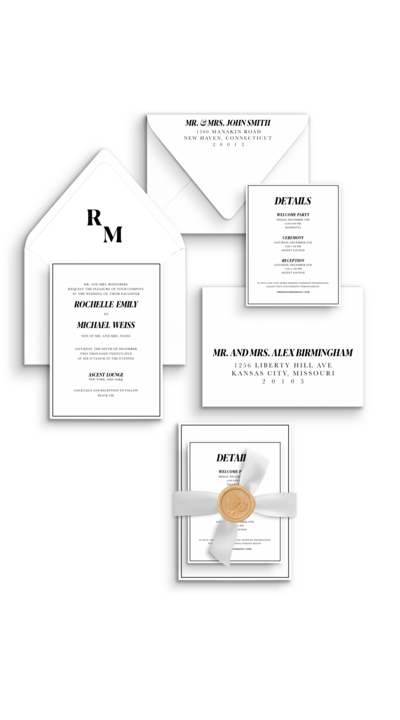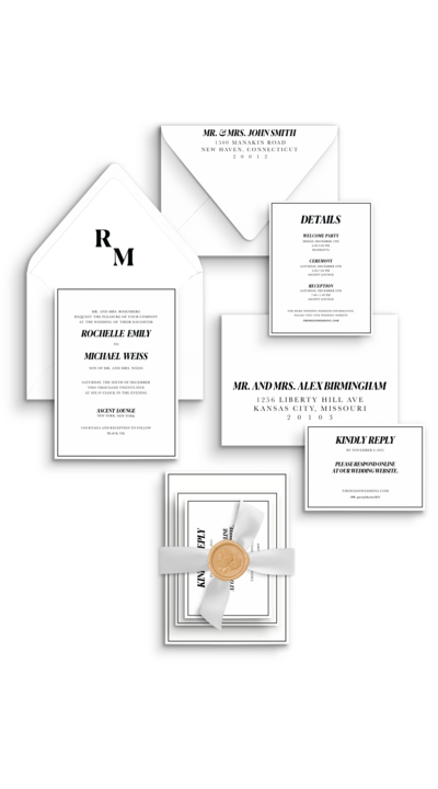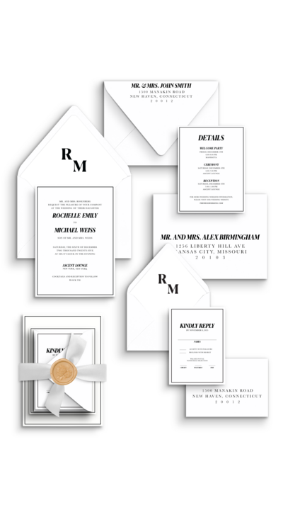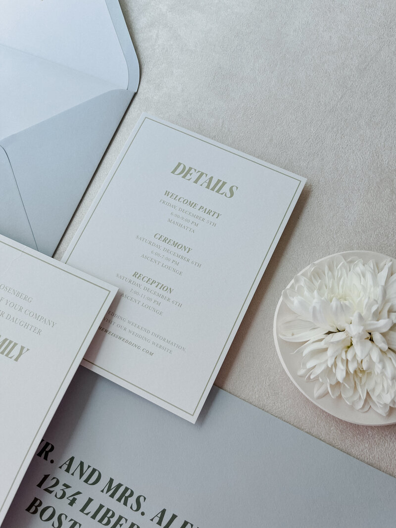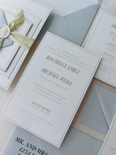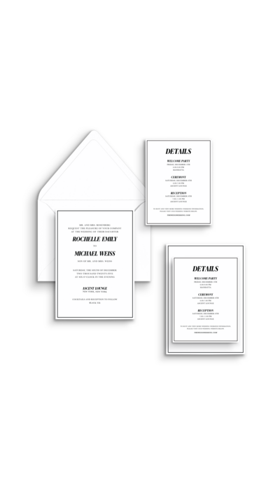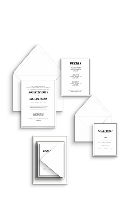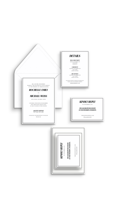 I chose strong, modern serif fonts as the focal point, reflecting both her refined sensibility and a contemporary flair that keeps the suite feeling current. Each design choice celebrates her impeccable taste while offering couples a stationery suite that is equally elegant and distinguished.