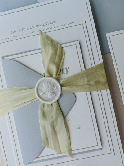 Embellishments shown: envelope liners, envelope addressing, wax seals, silk ribbon.