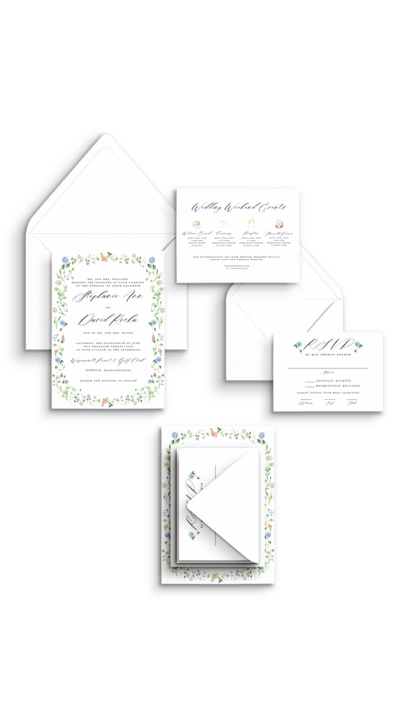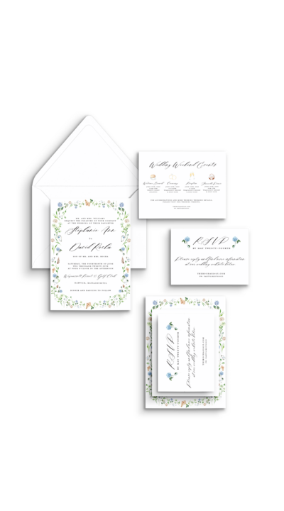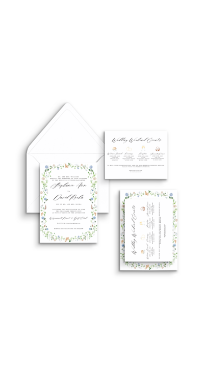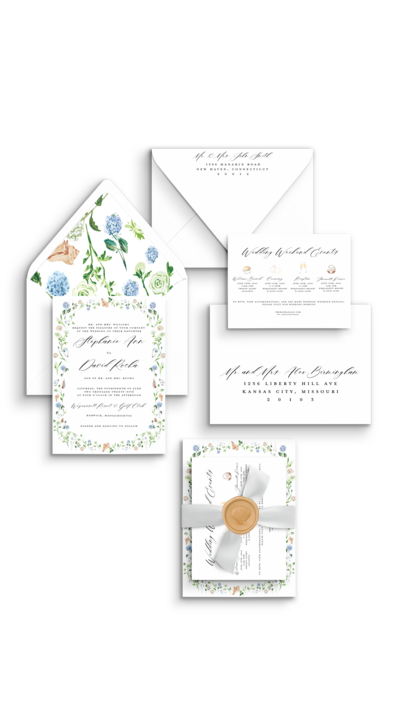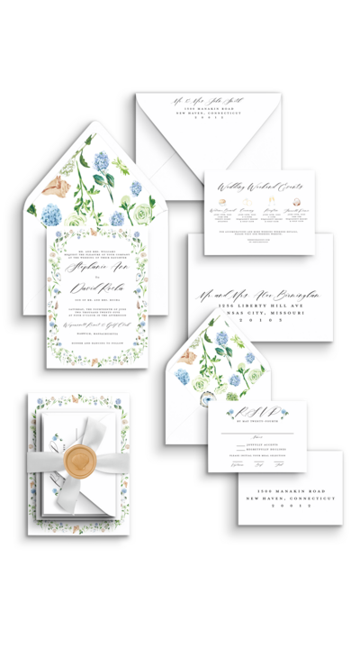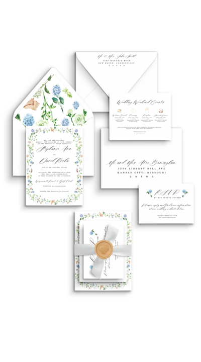 For Stephanie’s suite, I wanted to capture that serene, beachside feeling. Hand-painted hydrangeas and delicate shells evoke the light, airy essence of a New England summer, while a whimsical yet elegant script font reflects the joyful, effortless spirit of a coastal celebration.
